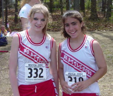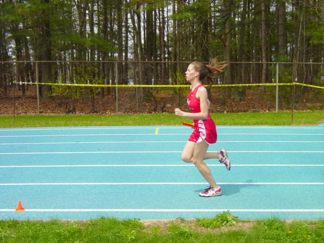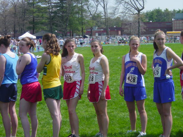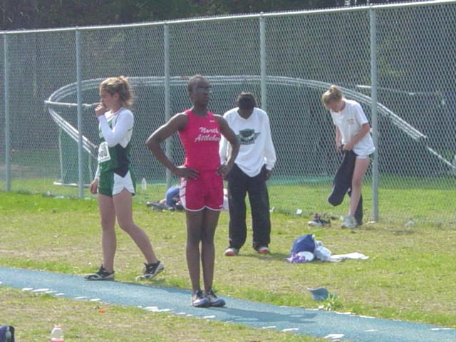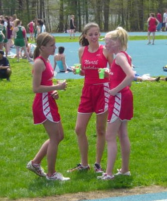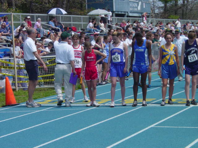 Holster explains the meet to Davis while the 4X800M cools down after the