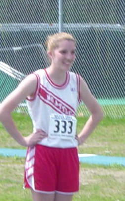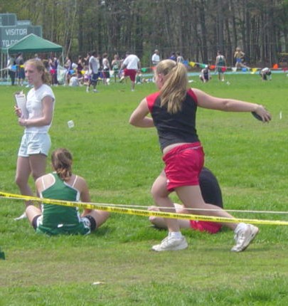 Rickard gets ready to triple jump while Liz Malone warms up at discus |