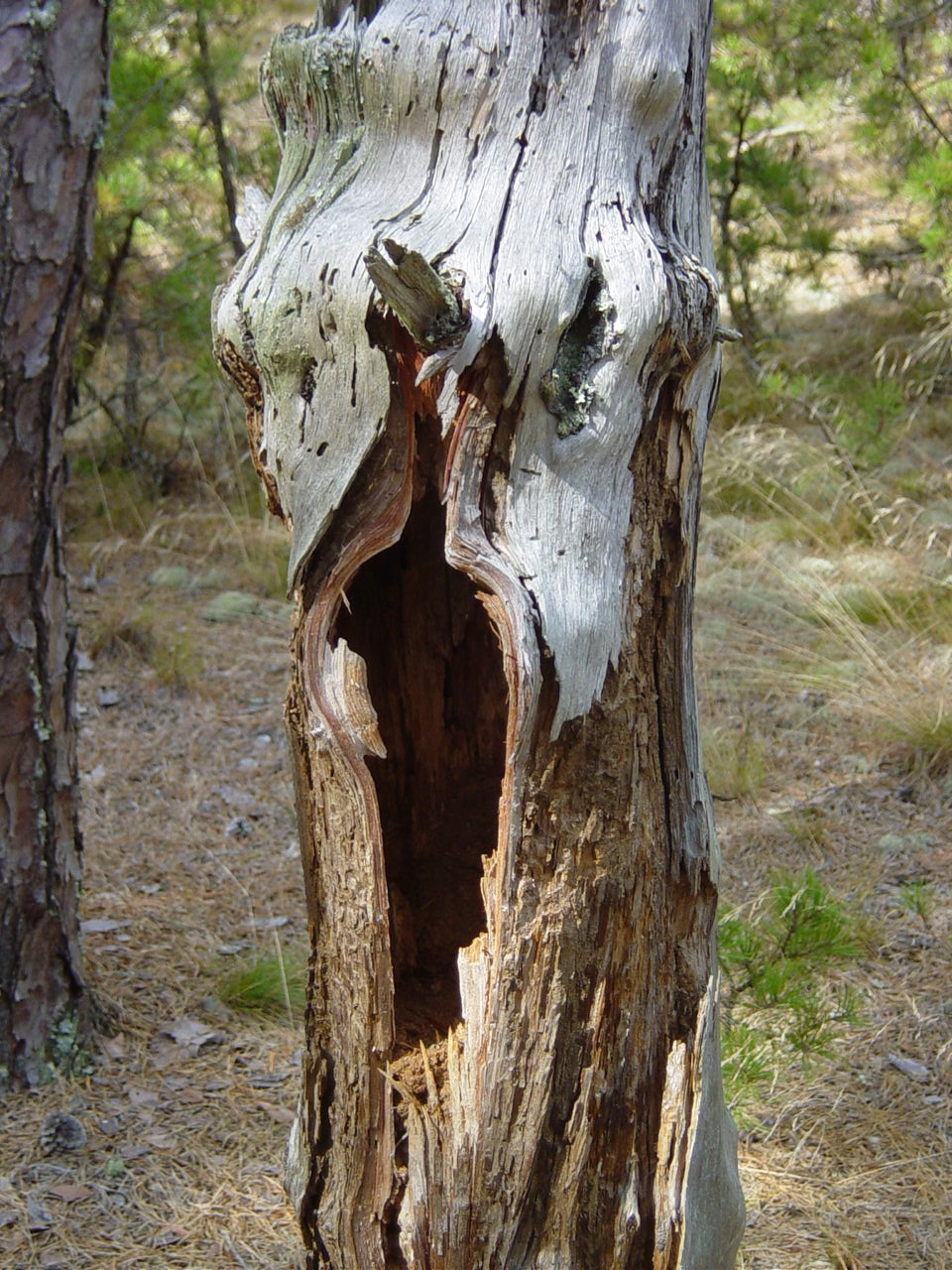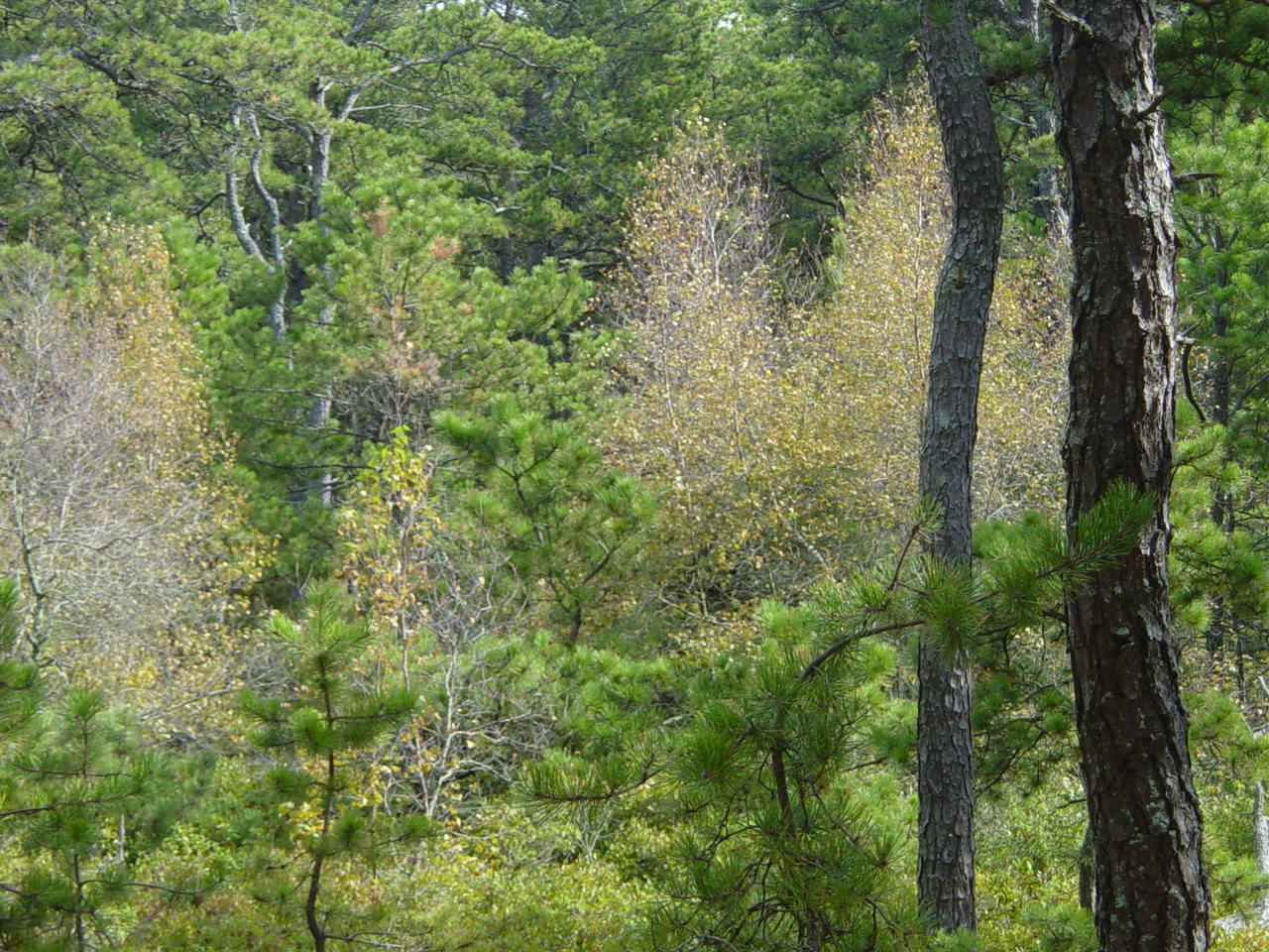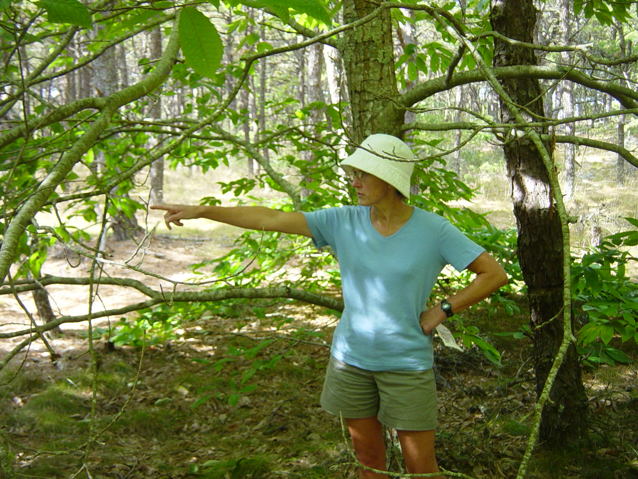 | At first I thought it was Vanna White but then I realized it was Arlene pointing out some girded pines. You can just make out the gird marks on the pine near her left elbow. IT is apparently done to kill the pines to make more room for the chestnuts. Now I'd like to but a vowel! |