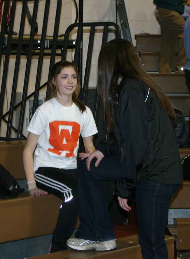 Ames frosh Jenna Davidner talks with her coach before the two mile. Jenna