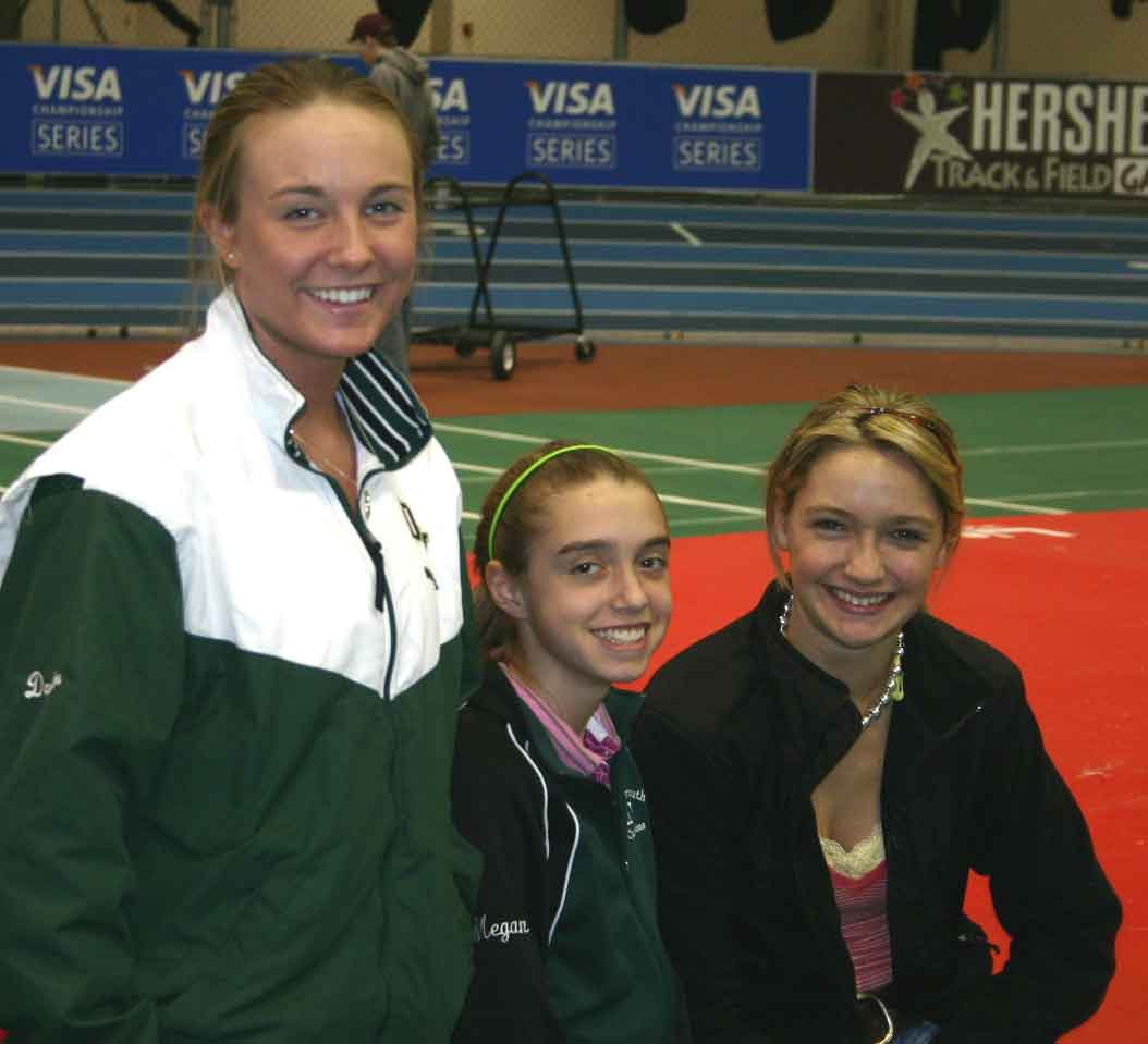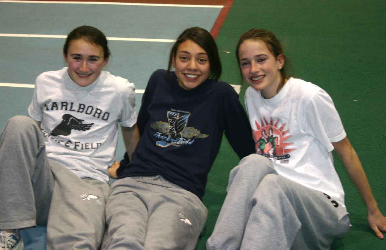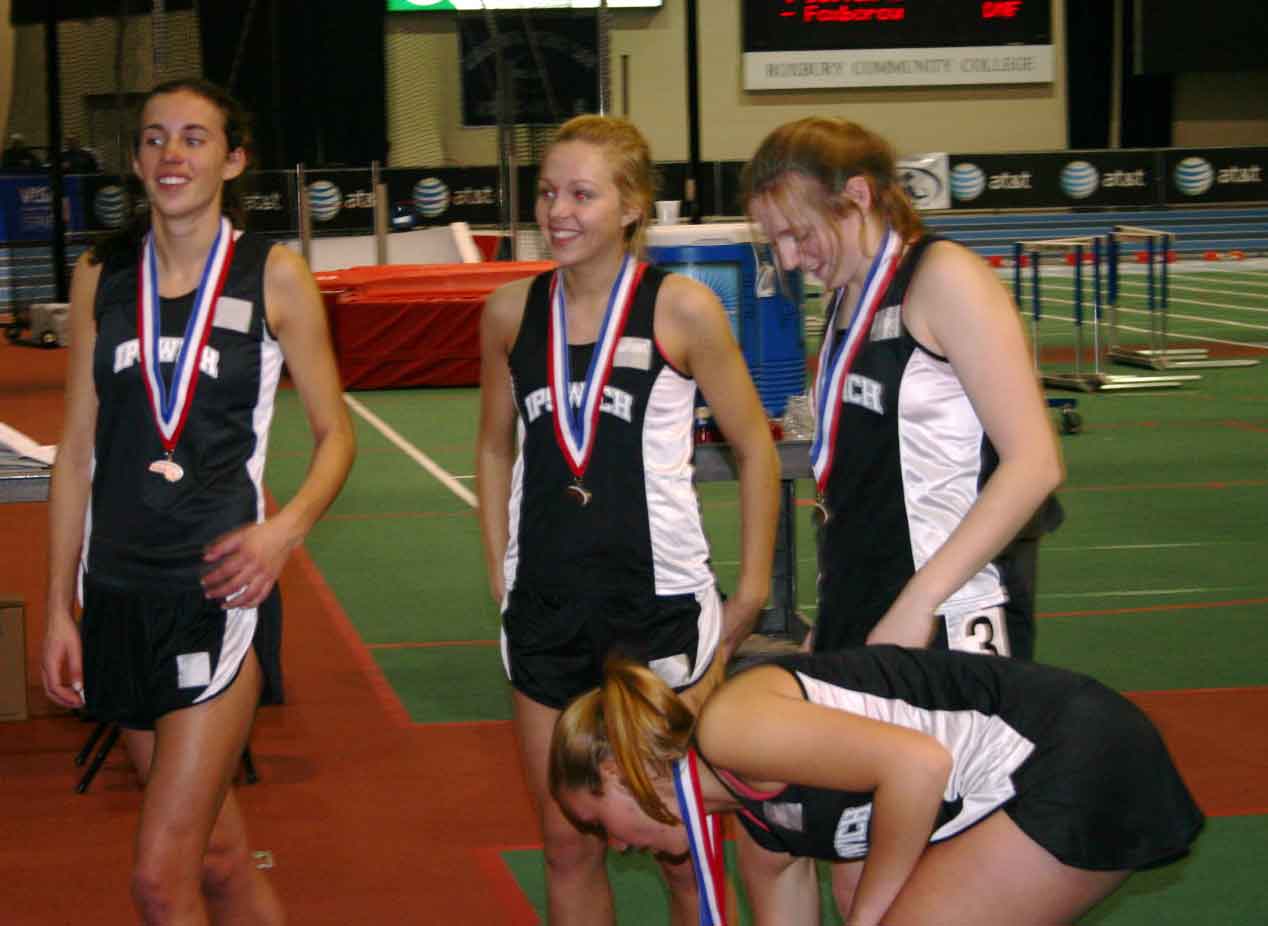 Allyson Oram (far right) was too embarrased to pose alone. She placed 3rd in the mile at 5:09.41. Here she is with two unidentified teammates. If you know their names, please contact me at northrunning@yahoo.com so I can include them. I heard from two separate people right away. Here's what they had to say. #1 I was looking at your 'random pictures' from the massachusetts all-state meet and saw that you were unaware of the names of two runners in a picture with Allyson Oram. The one on the left is senior Christina Kunycky and the girl in the middle is freshman Cathy Withers, both also from Marlborough High School. The three of them with along with sophmore Brianna Kunycky, Christina's younger sister, competed in the 4 x 800 relay. They placed 4th over all and ran a school record time of 9:37.31! Running the first leg was Brianna Kunycky, 2nd Allyson Oram, 3rd Christina Kunycky, 4th Cathy Withers. Hope that helps! #2