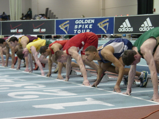 | Garrett Vandette in blocks before winning his trials heat. Look at the starting positions. The Hockomock runners have the best positions with the KP runner closest to textbook form. | ||