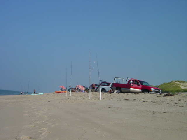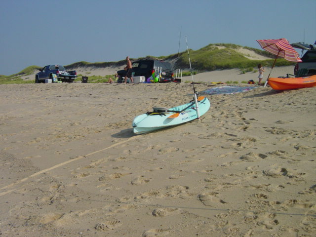 | There are some unique sites along the beach. It was mostly a family oriented area with a lot of fishing groups. Here someone has rigged their kayak with a pole-holder. |