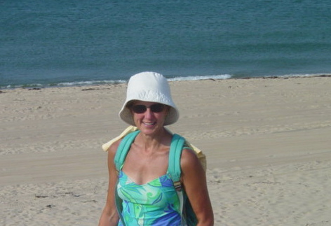 | Arlene keeps up the pace along the beach. After our swim we switched to barefoot walking but could not keep up the same pace. Having a schedule to meet our pick-up, we eventually switched back to sneakers. |