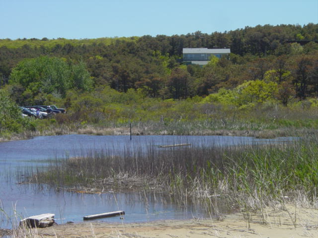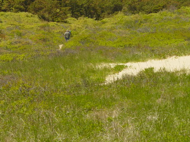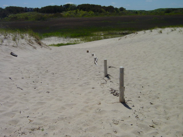 | Beyond this dune are the headwaters of the Pamet River. The river flows west from here and empties into Cape Cod Bay. Besides this spot, Rt. 6 is the only means of access (other than boat) to points north of here. This dune is substantial, but a freak storm (known as the "No Name Storm") that struck at night completely swept it away. Sand and salt water flushed into the Pamet River creating a shock to the ecology. | ||||