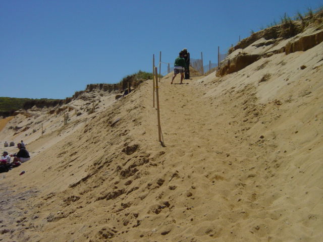 | This is the reconstructed beach access at Newcombe Hollow. Sand was brought in and shaped to make a path to the beach. | ||||