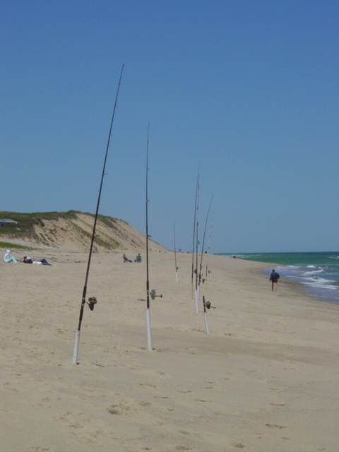 | With the spring migration of striped bass, the beaches become full with hopeful casters. Although this is a traditionally good place to fish, I didn't see anyone having any luck. | ||||