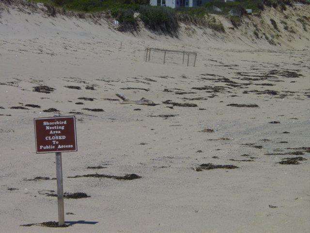 | Spring also means the nesting of shore birds. This net in the background protects a nest. With beach access by RV's totally prohibited in this area, the traditional struggle between preservationists, ecologists and beach access proponents. This area was once a popular 4-wheeling spot. Fishermen in particular would cover the entire stretch of my 12-month walk. Now the only signs of motor vehicles are the tire tracks of National Seashore Rangers or lifeguarding ATV's. | ||||
