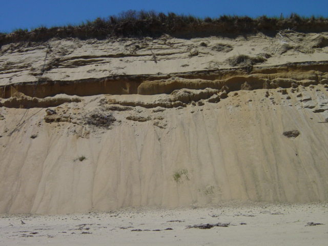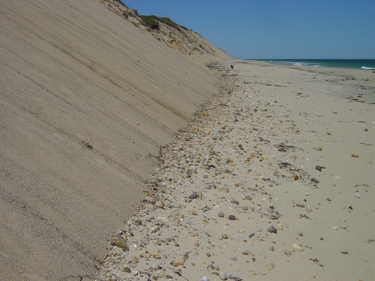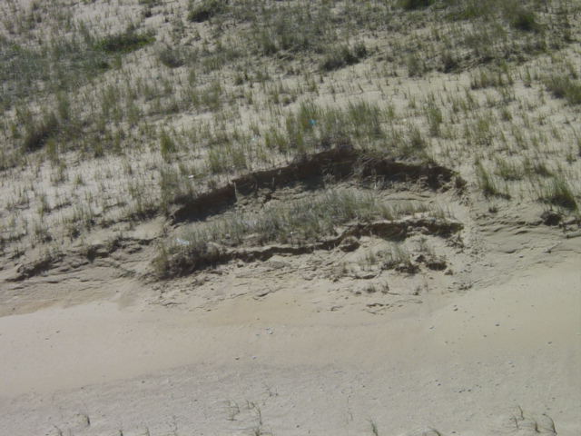 | Notice the dust blowing off this exposed ridge. Not only does wave action undermine the dune, but wind action constantly reshapes the face. | ||||