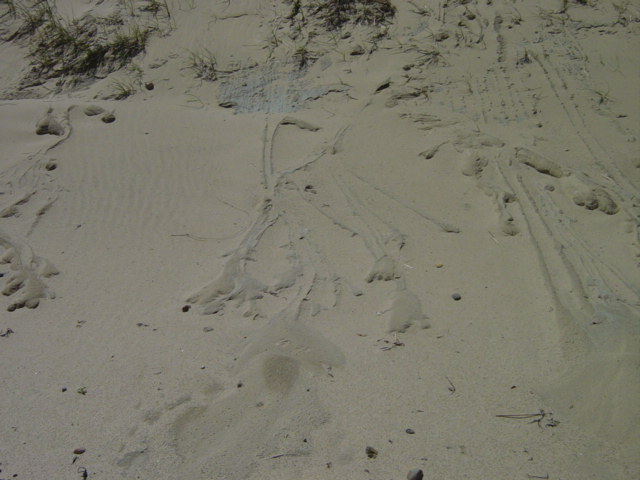 | Even grass growing on a relatively stable dune face can't stop the effects of gravity. Here is a cresent-shaped slide. I call this a stable dune because the establishment of grass such as shown here requires a static environment. | ||||
