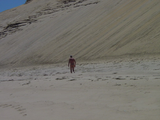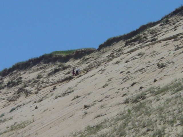 | A young boy and girl climb high onto the dune. They are roughly 75' up. They are part of a large group, the remainder of which were at the base. The challenge of climbing is alluring but they are tempting fate and helping speed the process of erosion. | ||||