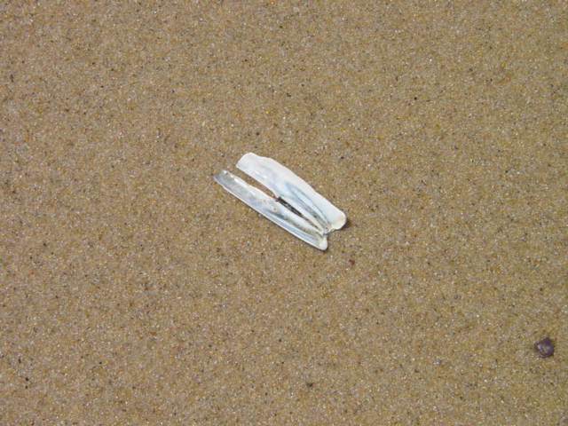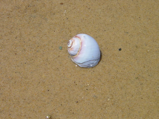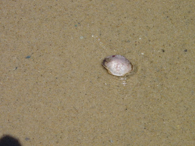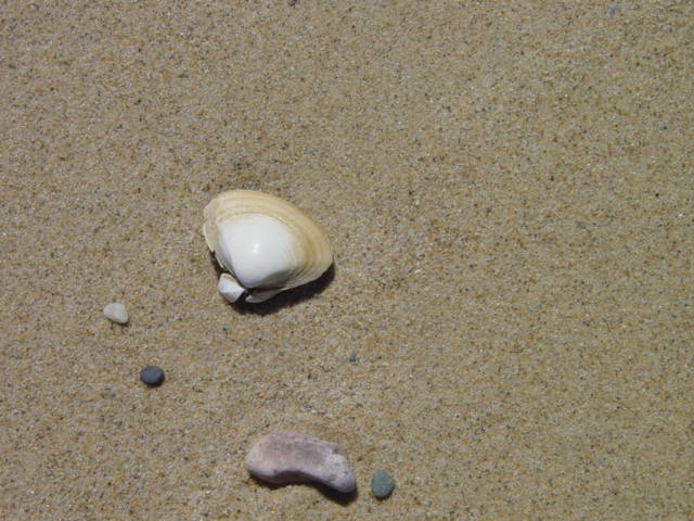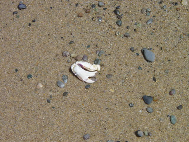 | Some signs of sea-life along waters edge. These were all found in a 10' circle. From left : moonsnail, creb claw, razor clam shell, crab shell and sea clam shell. | ||||