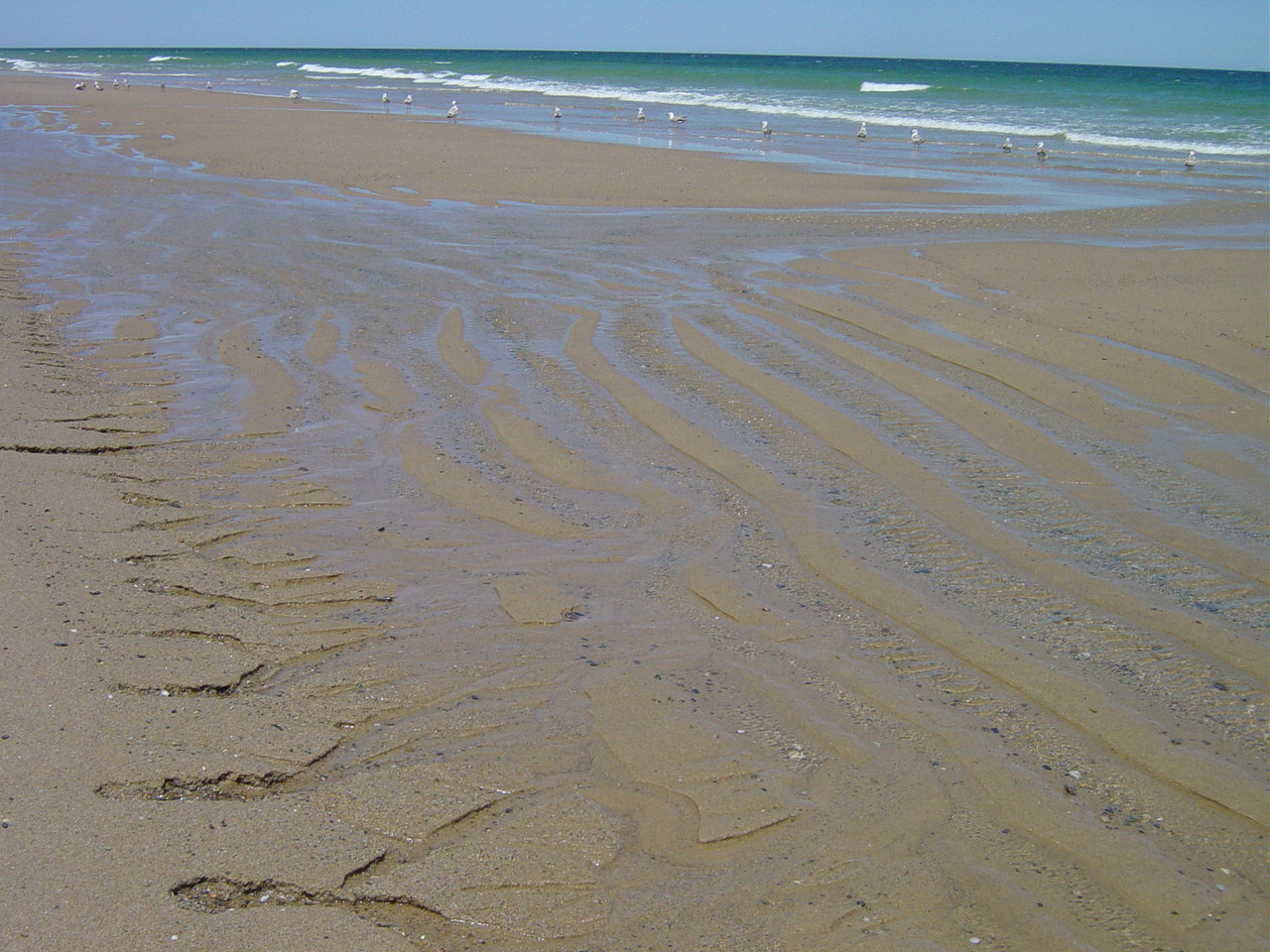 | This is the scene at low tide with an exposed sand bar. Water leaching from the sand creates erosion at water's edge. It is another part of the ocean's constant effort to claim the sand. | ||||