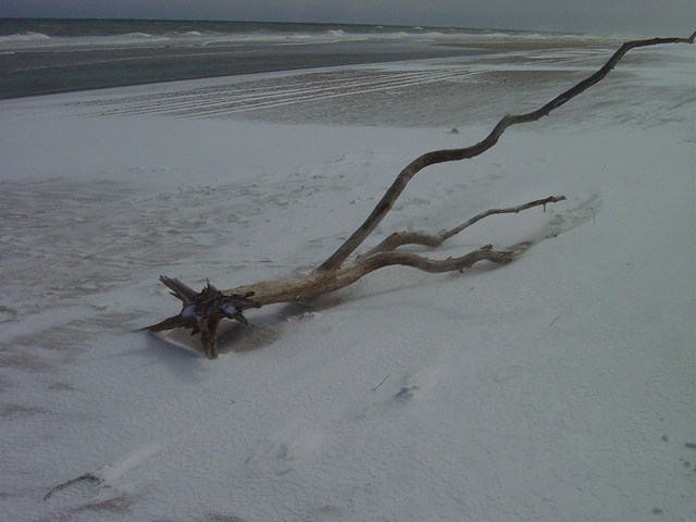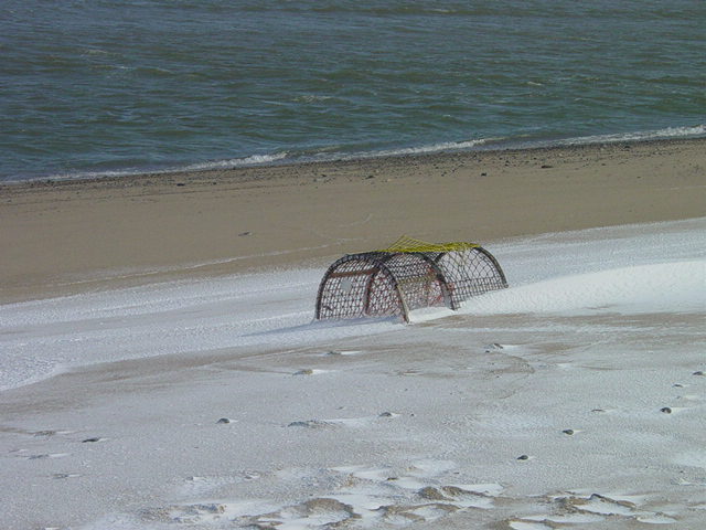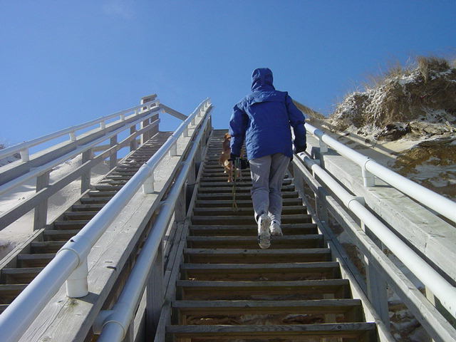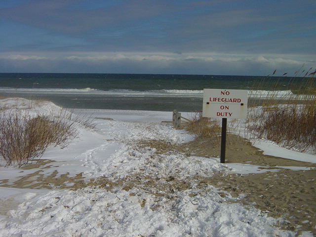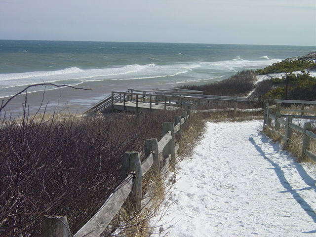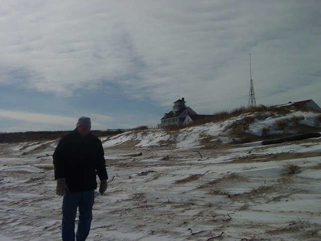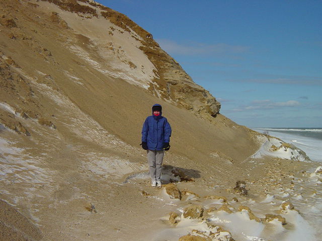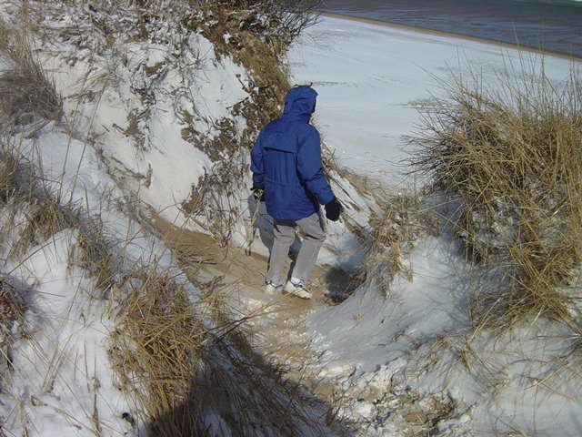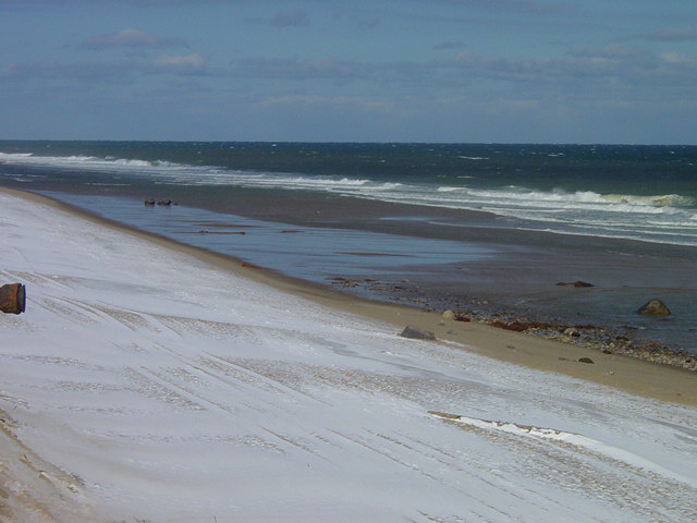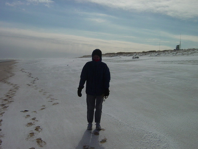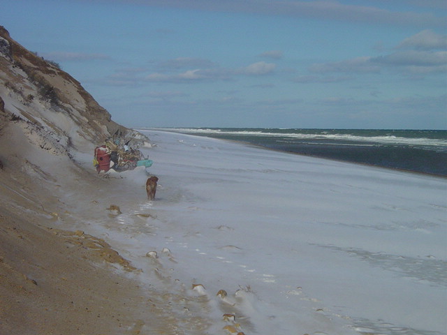 February 04 Man has assumed control of his environment to such an extent that bad weather is often no more than an inconvenience. Perhaps it is appropriate that this spot was to remind me how much we take the power of nature for granted. In 1977 I remember standing on a high spot overlooking the parking lot, concession stand and bath house at Coast Guard Beach. Arlene and I discussed how we would probably see the ocean overtake the protective dune within our lifetime. Less than a year later in the storm of “78” the ocean obliterated the dune, parking lot, and concrete building in addition to picking up the “Outermost House” from the outer beach and depositing it across the marsh at the base of Fort Hill. Still, prior to this walk I was a little embarrassed. After finding out how easy January was, I was beginning to wonder how hard this year’s goal would be. I pictured an easy 3.5 miles or so in the usual early thaw of February. Instead, I was humbled by a one-mile mostly backward (to protect the face from frostbite) walk. The frigid wind curtailed the trip and now I have to reconsider my goals. Historically, at least since 1975, most February vacations have provided tolerable weather. In 1981, we were able to cap the foundation of our summer home while working in shirtsleeves. Other years I’ve been able to ice fish, with little discomfort. In 1991 we winterized the house. Although there was nearly two feet of snow on the ground, the weather was great. We often took breaks to make toboggan runs on the isolated hills of South Wellfleet. I had imagined that today’s walk would either be too easy or have to be extended to create a challenge. It was either a simple mile from Coast Guard Beach to Nauset Beach or forge on into Wellfleet. We woke to cold weather and a surprising storm that dropped a quick two inches of snow. I was excited by the prospect of having at least minor adversity. Arlene and Biscuit decided to accompany me on this leg. We dropped the car at Nauset Beach, then Emily and Matt shuttled us to Coast Guard Beach. The distance of a single mile wouldn’t take long. Although the wind was whipping I noted the direction and figured hugging the dune would provide at least partial protection. For a moment I considered making the trek North to South keeping the wind at our back, but remembered my vow to complete the walk sequentially. Directly into the wind it must be! Once on the beach it took less than one hundred yards to realize that this would not be the cakewalk I anticipated. Every square inch of bare skin was assaulted by a biting cold that can only be understood when experienced. In the time it took to snap a few pics the hands became numb. Frostbite became an immediate concern. The sun was so deceiving. There was no warmth. Nearly half the total distance was done walking backward to save faces from the onslaught. Only biscuit seemed unfettered. My usual modus opperendus would be to walk the low tide line. Then as whim struck I would head to the wrack line to survey the detritus and observe the bottom of the cliff for unusual spillage. I was going to pass by the same area where erosion and dune excavation had once uncovered burning pits and Native American artifacts. There was to be no exploration. Cold kept exploration to a minimum. The bottom edge of the dune was covered by snow; the wrack line was non-existent. Recent wave action had attacked the cliffs and the only beach litter was rocks, pine branches and clumps of sod that had slid down the bank. When reading accounts of winter shipwrecks I’ve often wondered why there were so few survivors. So close to shore, clearly in sight of land, how could they not make it? After less than a quarter mile my lifelong question had been answered. They would hit the water with a sudden shock. Soaked clothing would weight them down. If it took more than a minute to reach land strength would quickly drain from their bodies. Soon their only hope would be to wash nearly lifeless up to the beach. Once on land they would find the wind more brutal than the water. Ice would immediately form on the body. If they were able to crawl the seemingly endless distance to the base of the dune, they would be confronted by a 50’ to 100’ high nearly vertical wall of sand. The only hope at this point would be the arrival of the surfmen. Unless a fire had already been built the life would slip away long before they could be taken to one of the dune shacks or lifeguard stations. Back to our task at hand. I only took one side trip to water’s edge. After snapping a few pictures I retreated to the dune line but found little comfort. We were headed directly north, and the snow was blowing directly south. We would walk backwards, occasionally running into some 8” drifts that were arranged like windrows in a hay field. Or sometimes hitting our heels on some of the larger rocks that had rolled down the dune face. When our faces were warmer we’d turn around and lean deeply into the steady gale, picking up the pace. Despite cold extremities sweat started to build under protective layers of clothes. With ocean on our right and sheer cliffs on our left this proved to be a desolate area. Plans are now in the works for Eastham to create their own ocean beach somewhere along this stretch. During the creation of the Cape Cod National Seashore, Eastham ceded their beaches to the government. A prevalent feeling among year-round taxpayers is that the Seashore has not lived up to their promise to maintain free access to local residents. So although the new beach is controversial, the movement is steadily gaining momentum. Just once there was a slight cup in the dune face. Moving slightly up the face it was possible to get out of the direct wind. After a brief moment we moved on. There was only one low outcrop of clay along the entire walk. Signs of erosion were constant. There were many small rocks along the dune line as well as clumps of sod and pin