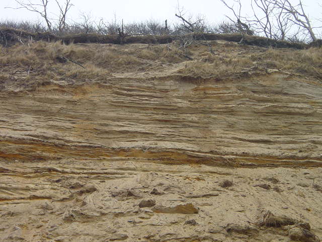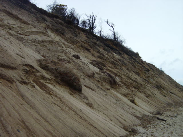 | The wooded rim of the dune was a trait that didn’t continue very far into Wellfleet. So during the Eastham walk you could look up at scrub oak hanging onto the edge, and in many locations the losers of the fight against erosion and gravity would be partway down on their fall to the beach. Whereas Wellfleet’s dune faces were more pristine. There would be a few patches of dune grass that had finally let go and made the plunge, but for the most part it was nothing but fine sand. Sometimes it would be a smooth face all the way from crest to base. At other times there would be distinct horizontal banding, the sand having been placed down in layers. | |