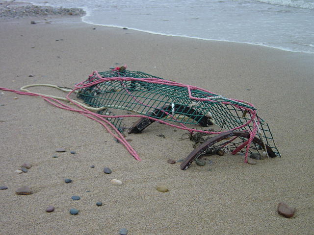 | The wrack line was filled with shells, seaweed and a surprisingly small amount of human debris. A few Bic lighters were twisted among the weeds. Pieces of rope, plastic, wood and lobster traps were the most common debris. There were four lobster traps along the wash-line, nearly complete and half-buried in the sand. Whenever someone buys a lobster they are helping to pay for the hundreds of traps that suffer this fate each year. | |