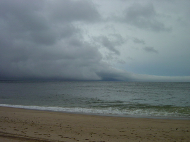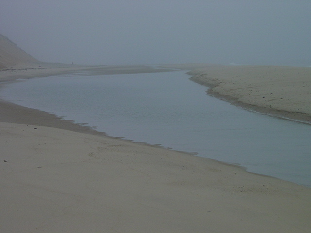 | This is a good time to mention the weather. We had watched the rain all morning contemplating whether to walk today or put it off until the more favorable forecast of Sunday. There was actually some clear sky as we set off down the beach but within ten minutes there was a dark wall forming ahead of us. Though it looked ominous for the start of what would be a long walk, it turned out to be mostly fog. The temperature dropped 10 degrees (from about 50 to 40) the instant we hit the fog, but it wasn’t unpleasant – we just had to keep hats on. The remainder of our walk was in varying degrees of clouds and fog. | |
