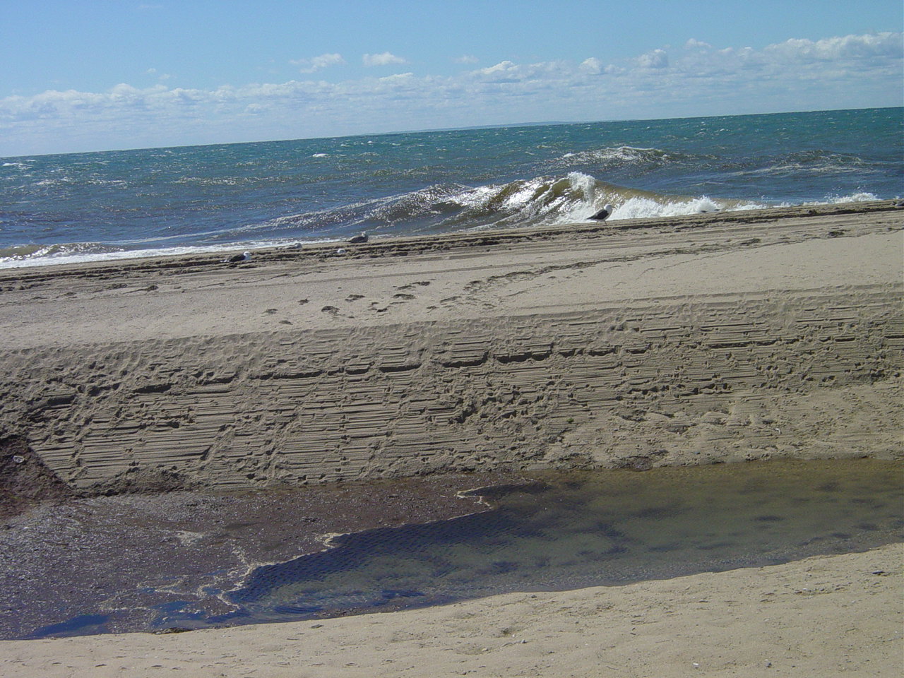 | This water remains in a deep pit on the beach just in front of the lighthouse. At high tide water will rush over and completely fill it. |