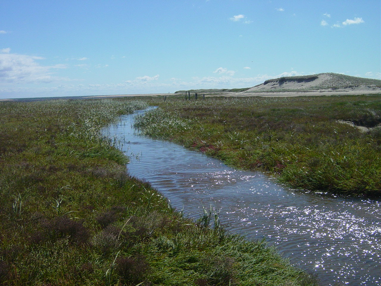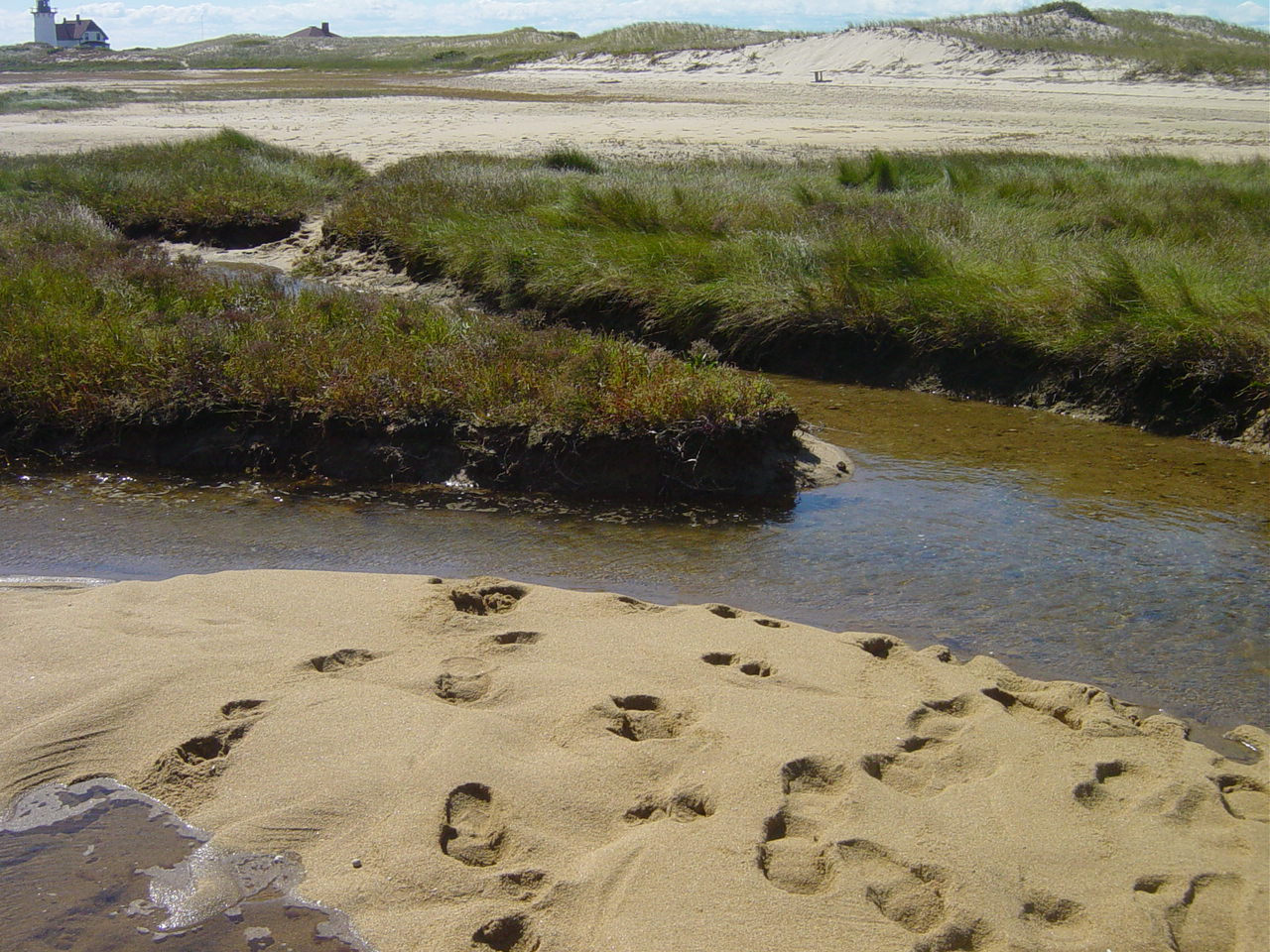 | We reached the dike that slows water from reaching the upper reaches of Hatches Harbor. The dike was built in 1930 and the PTown Airport is on land that was once tidal. Now the National Seashore is slowly increasing water flow into the upper reaches to reclaim salt marsh. About five years ago Ethan was involved in the baseline study to determine the animal life in the upper reaches. Future studies will show the changes that occur during reclamation. |
