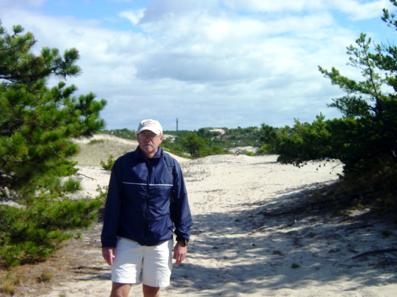 | Our last three walks have pointed out something I had never thought about. The PTown Monument pops up at the most unlikely times. You can be walking the outer beach and climb to a dune top and there it is. Or as in this case, you can be walking through wooded dunes and at a small clearing you find a clear view. |